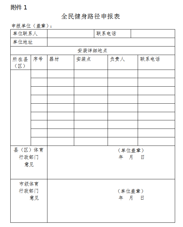 第八条 每年 5 月 31 日前,县(区)体育行政部门汇总上 报全民健身路径申报表(附件 1 )。