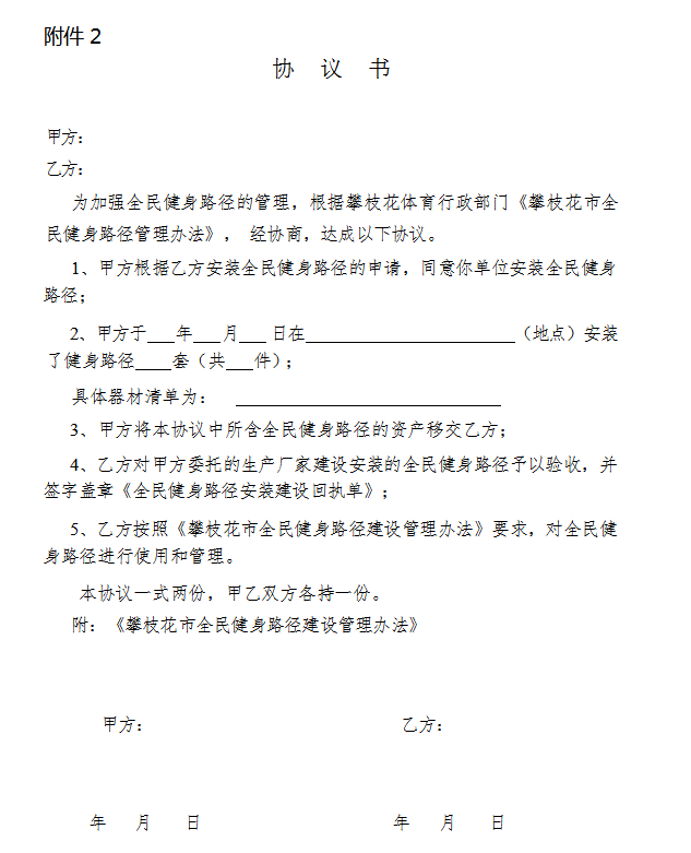 第十五条 投资建设的全民健身路径,体育行政部门应与受 赠单位签订协议书(附件二),并按财务要求完成资产移交。