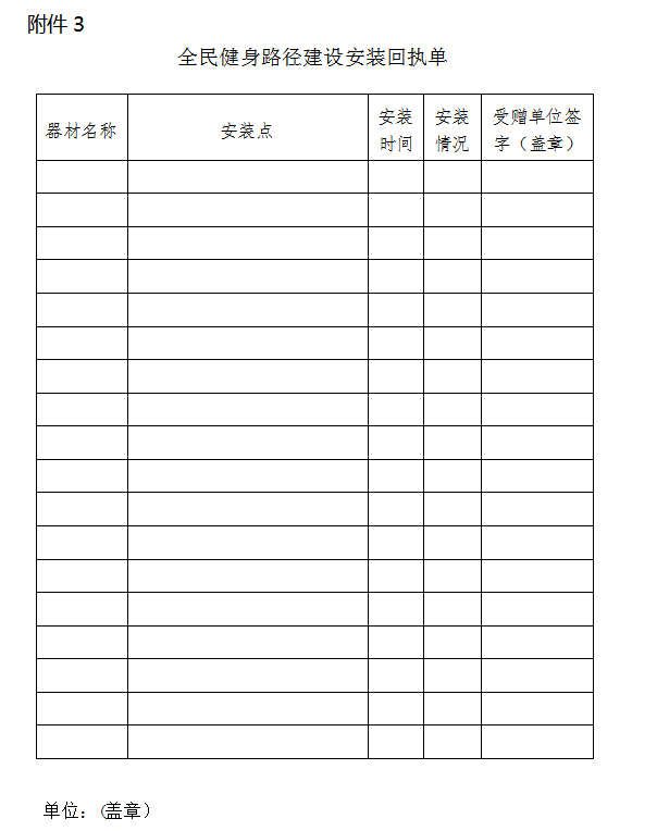 第十二条 安装完毕后,经县(区)体育行政部门和受赠单 位负责人实地验收后,填写《全民健身路径建设安装回执单》(附 件 3 )并签字盖章,上报市级体育行政部门存档备案。