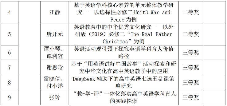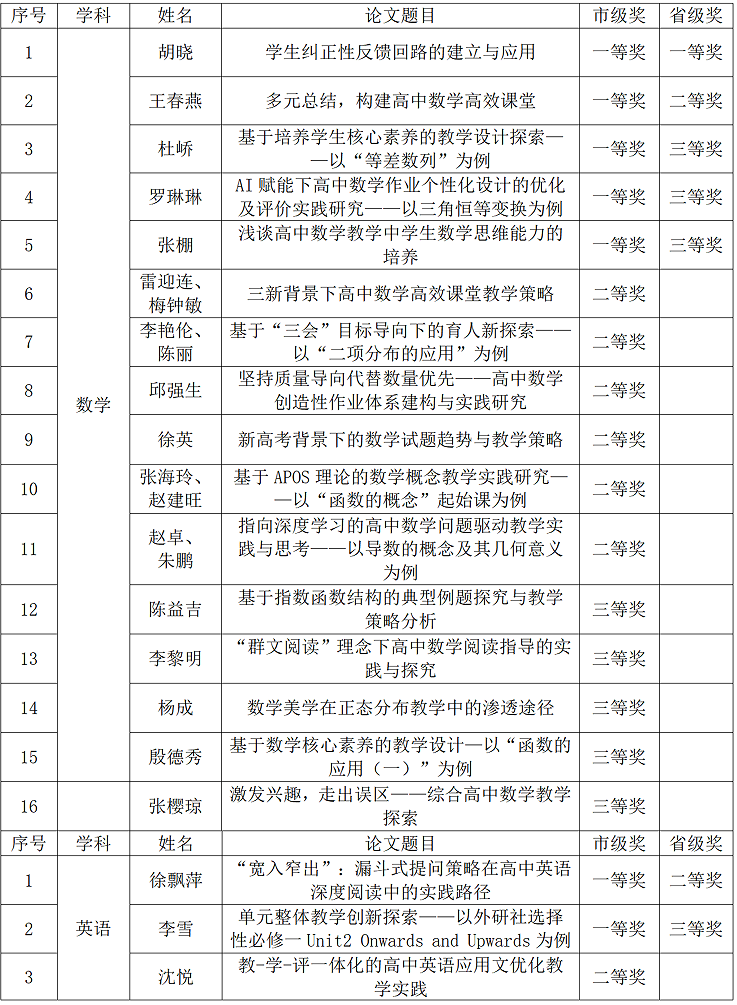 近日,2025年四川省普通高中数学和英语学科教育教学优秀论文评选结果正式揭晓。市七中多名教师凭借扎实的教研积淀与创新的教学探索,在省、市级评选中捷报频传,充分展现了学校雄厚的教研实力和教师队伍的专业素养。