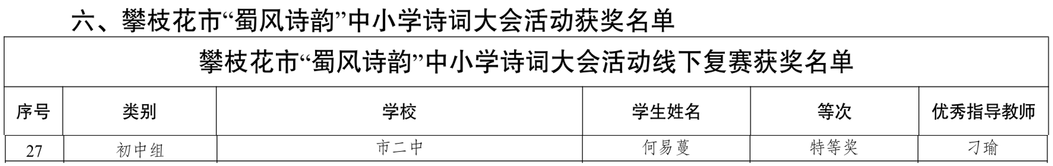 在2025年中华经典诵写讲系列活动中,攀枝花第二初级中学校师生积极参加,获得多个奖项:特等奖1项,一等奖2项,二等奖2项,三等奖3项,优秀奖3项,另有2位教师荣获“优秀指导教师”称号,这全面展现了市二中在中华优秀传统文化教育与素质教育方面的深厚底蕴。