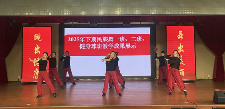 展演现场,学员们身着特色服饰,以整齐舒展的动作、富有感染力的表现,表演了民族舞蹈《情罪》《醉乡》《一朵情花开》和健身球操《骏马奔驰保边疆》,展现了本学期学习成果,生动诠释了 “跳出健康、舞出美丽” 的活动主题,现场掌声不断。