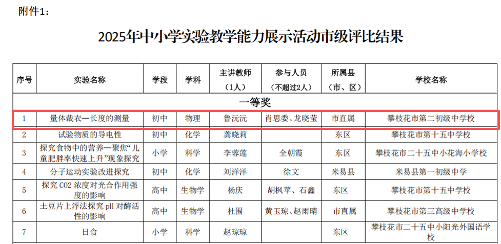 此外,在2025年攀枝花市中小学实验教学能力展示暨“基础教育精品课”实验精品课市级评比中,鲁沅沅、肖思委老师的课程《量体裁衣—长度的测量》荣获市级一等奖。该课程以“网购衣不合身”切入,以人体为实验载体,融合多种测量方法,成果转化为成衣卡,三维评价赋能,兼顾趣味与实用,落实新课标物理核心素养。