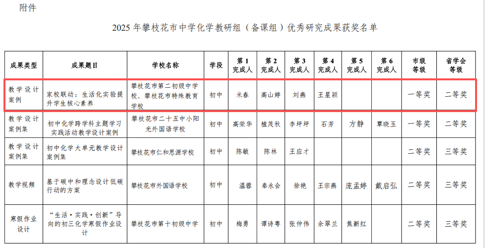 与此同时,在2025年攀枝花市中学化学教研组(备课组)优秀研究成果评选活动中,米春老师与刘燕、王星颖老师共同完成的教学设计案例《家校联动:生活化实验提升学生核心素养》荣获市级一等奖,并斩获省级学会二等奖。该案例聚焦学生核心素养培养,以独特的视角,将生活化实验设计与家校协同育人机制有机结合,探索了化学教学的新模式。