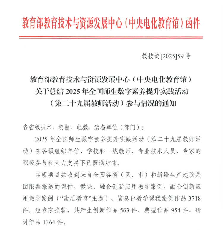 近日,教育部教育技术与资源发展中心(中央电化教育馆)正式公布2025年全国师生信息素养提升实践活动获奖名单。攀枝花市教师团队在基础教育组常规项目中崭露头角,凭借锐意创新的思维理念、扎实过硬的实践能力与精良出色的作品呈现,从全国众多参赛队伍中脱颖而出,成功斩获2项国家级奖项,为全市教育数字化转型发展再添浓墨重彩的一笔。