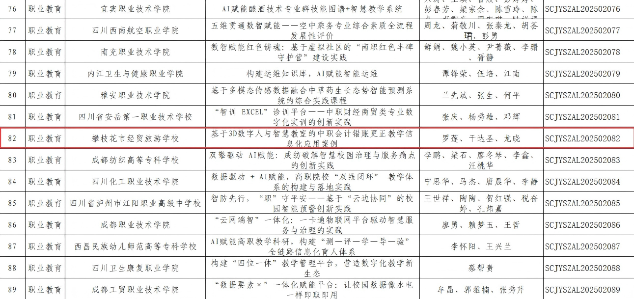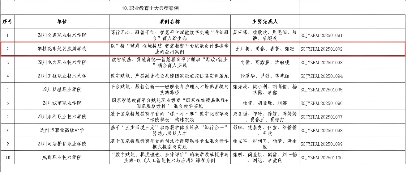 近日,四川省教育厅公布了2025年国家智慧教育平台应用、数字校园应用场景案例评选结果,攀枝花市经贸旅游学校参评的案例,分别入选省级典型案例和优秀案例,充分展现了学校在智慧教育领域的创新实力与显著成效。